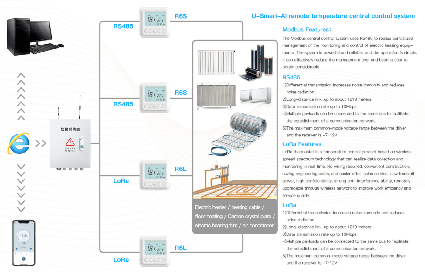 The Modbus central control system uses RS485 to realize centralized management of the monitoring and control of electric heating equipments.It can be connected to the hotel or third-party building automatic control system.The system is powerful and reliable,and the operaction is simple.It can effectively reduce the management cost and heating cose to obtain considerable economic benefits,and at the samd time fully realize heating comfort.